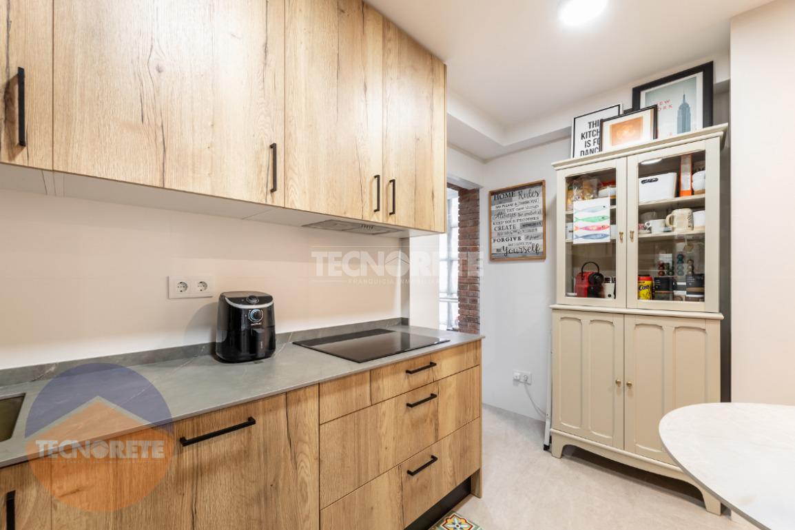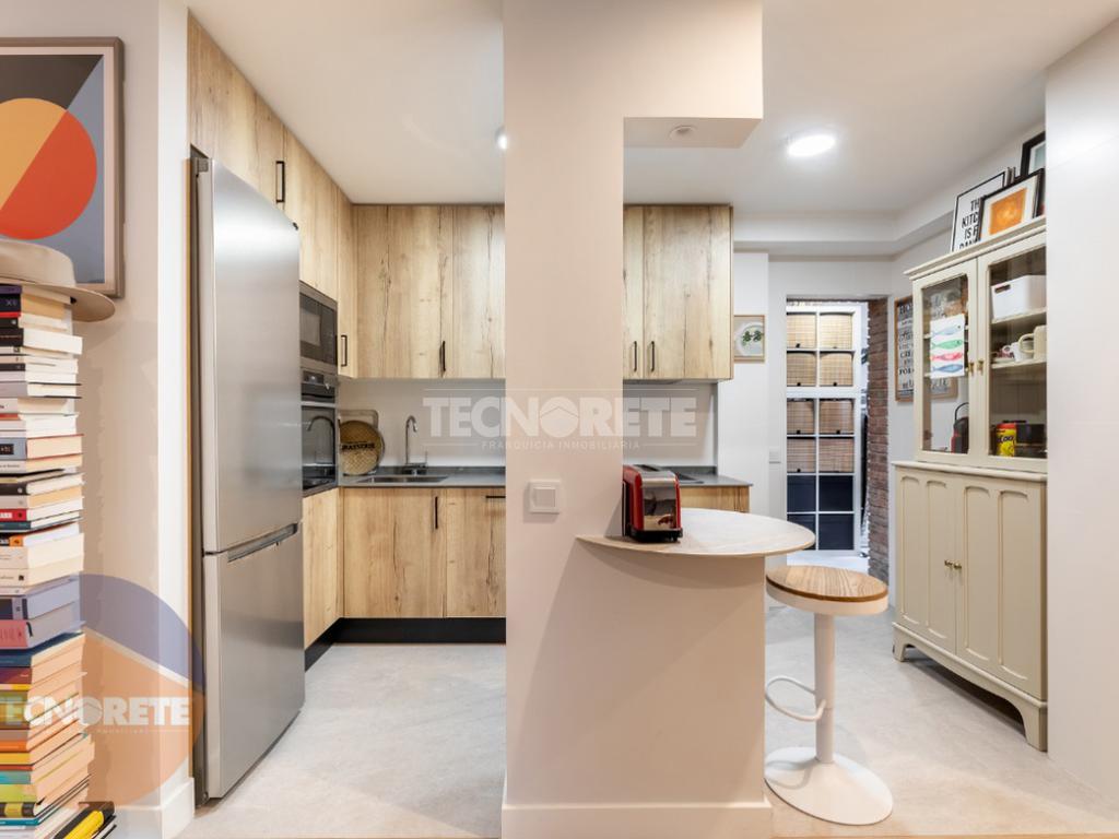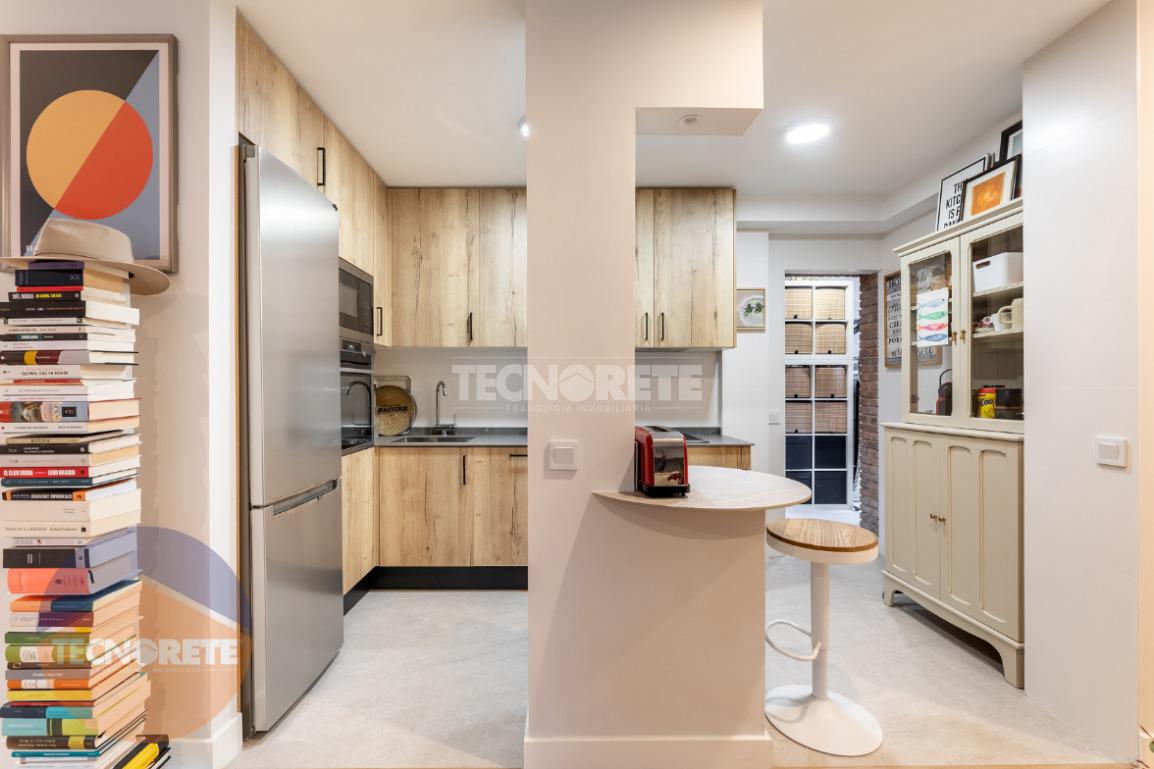 Cocina americana abierta, con salida a tendedero y con una pequeña mesita para desayunar o tomar el aperitivo.